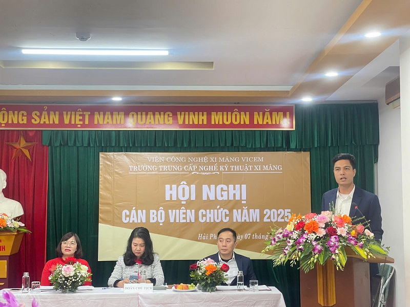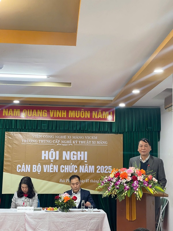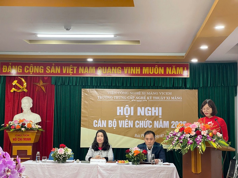 Sáng ngày 07 tháng 3 năm 2025 tại trường Trung cấp nghề kỹ thuật xi măng đã diễn ra Hội nghị CBVC năm 2025 và tổng kết công tác năm 2024. Về dự hội nghị có Ông Trần Anh Tuấn - Bí thư Đảng ủy - Phó Giám đốc phụ trách Viện CNXM Vicem, Bà Đỗ Thị Hạnh - Chủ tịch công đoàn Viện CNXM Vicem. Về phía Nhà trường có cô Vũ Trinh Ngọc - Phó bí thư Đảng ủy Viện CNXM Vicem - Bí thư Chi bộ - Hiệu trưởng Nhà trường, các đồng chí trong Hội đồng Trường, BCH Công đoàn, các đồng chí lãnh đạo các phòng ban, BCH Đoàn TNCS HCM, cùng toàn thể CBCNVC Trường.